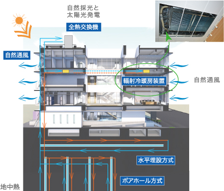 その考えのもと、清水建設が近年推進しているのがecoBCP※。eco=平常時の「快適な省エネ技術」、BCP=非常時の「巨大地震・津波対策」として、安全・安心を確保する技術を提供するもの。加えて、建物オーナーや入居者、住民のエネルギー対策として、平常時は「確実な節電」技術、非常時は「エネルギーの自立性確保」のための技術を提供します。