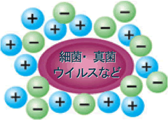 プラズマ放電により、プラスとマイナスのイオンを発生させて空気中に放出し、浮遊カビ菌やウイルス、アレルゲンを取り囲んで、その作用を抑える画期的な空中除菌技術です。