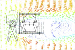 移動作業車周りの風況解析結果:風が渦巻き(青の部分)、列車への影響が大きい