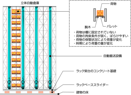 東日本大震災では、継続時間の長い揺れにより、震源から半径300kmにわたる広い地域において立体自動倉庫※1内のラック架台で荷崩れ被害が発生しました。なかには、建物自体の被害がなかったにもかかわらず、自動倉庫内の一部の荷崩れによって搬送機器が使えなくなり、自動倉庫の業務再開に数ヶ月を要した事例も見受けられました。首都直下地震や南海トラフを震源とする巨大地震の発生が危惧されるなか、物流の核をなす立体自動倉庫の荷崩れ対策は急務と言えます。