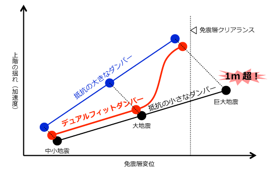 巨大地震の発生が懸念される現在、免震層の変位が免震ピットのクリアランスを超え、建物が免震ピットに衝突することが危惧されています(下図の黒線)。これに対して、オイルダンパーを増やすことで巨大地震時の免震層変位を抑えようとすると、頻繁に発生するより小さな地震時にも免震装置の変形を抑制するため、上層階の揺れを十分に抑えることができず、結果として、免震効果が損なわれることになります(青線)。