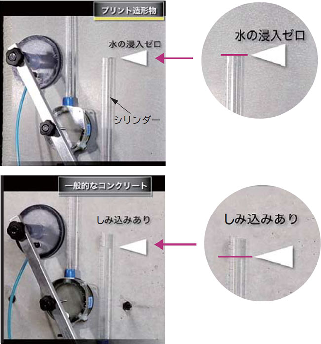ラクツムは、固まるのを待たずにコンクリートを積み上げることができ、また、積層によって一層ごとに圧力がかかるため、積層面が馴染みやすいという特長があります。積層後に表層をカットして断面を確認すると、ラクツムが稠密に一体化しており、目視では積層面(1層ごとの境界面)の痕跡は見受けられません。吸水性能を評価する試験を行ってみても、一般的なコンクリートに比べて吸水速度が低い結果が得られ、水や空気の侵入を防ぐ性能を有していることが分かりました。